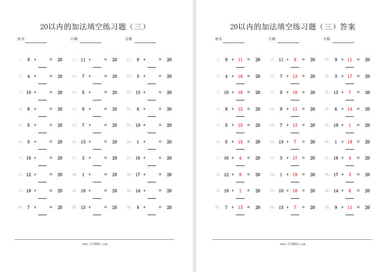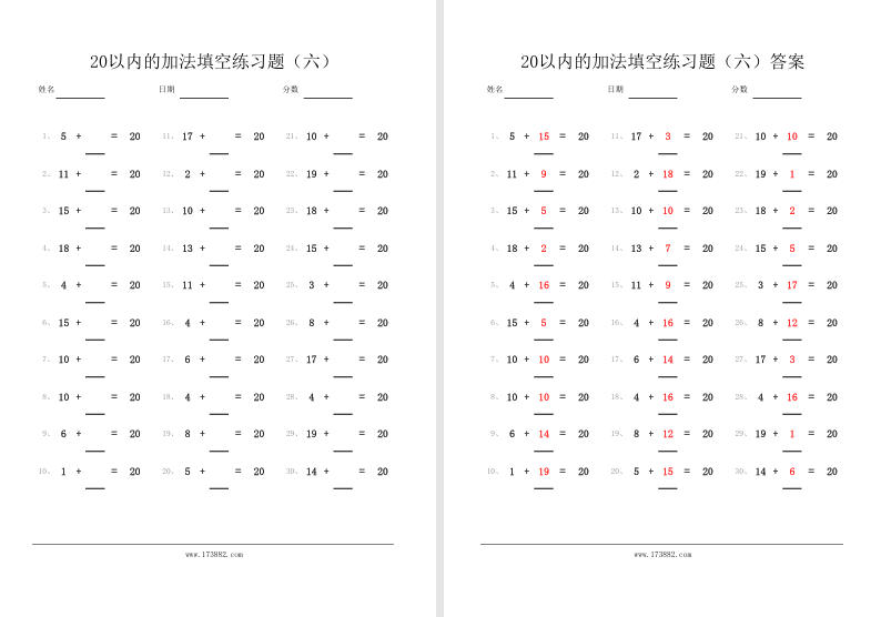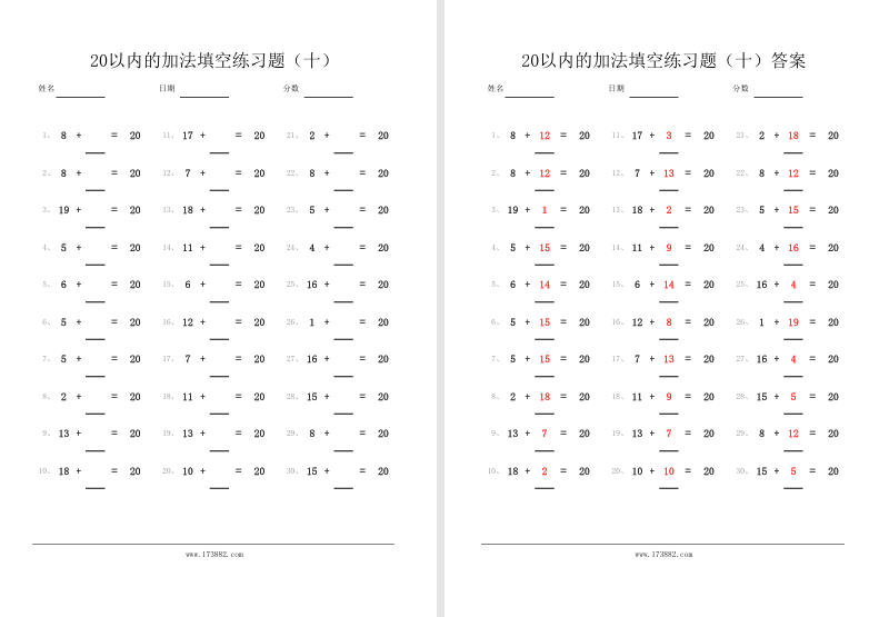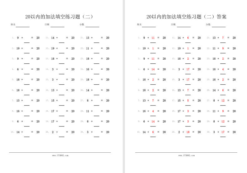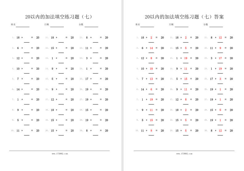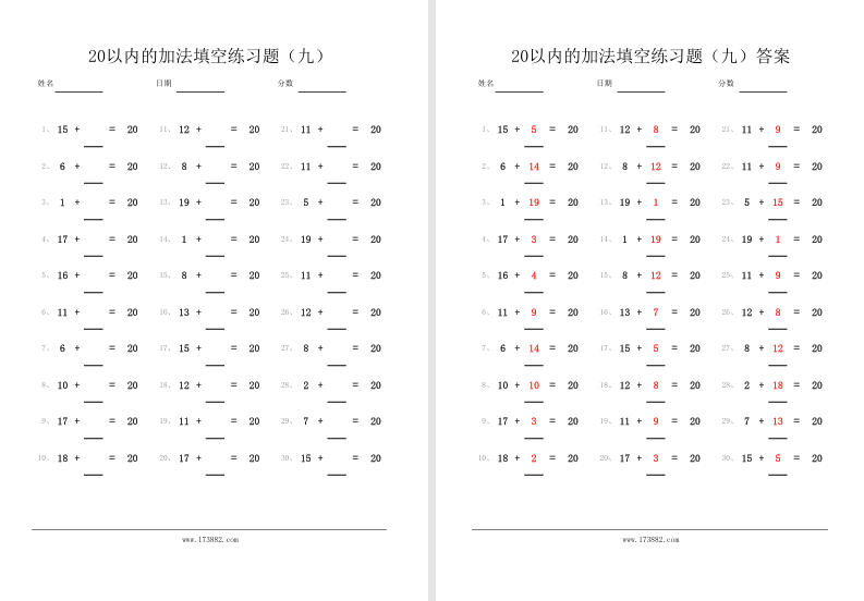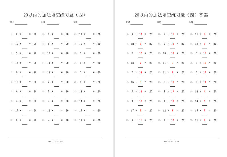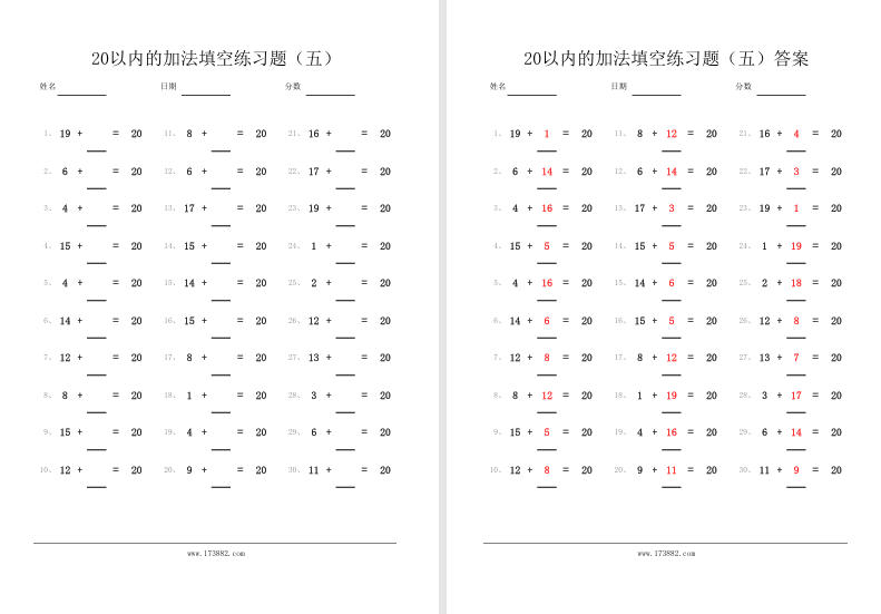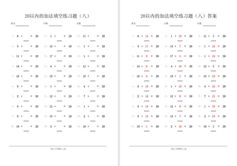 这是一个免费下载、可打印的数学练习文档,融合了 20 以内的加法填空练习问题。